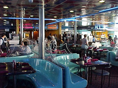 Aside from the formal dining rooms, the ship had a buffet-style dining area called the "Panorama Bar & Grille". It was located on the next-to-uppermost deck at the aft of the ship. It had windows all around. The food in the formal dining room was CIA-quality, but the food up here was pretty good too, and real quick. There was also a 24-hour pizzeria in the Panorama Grill.